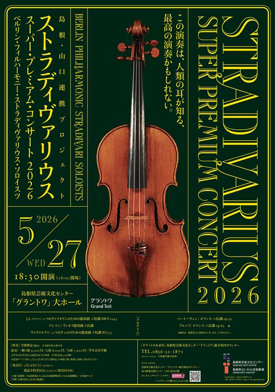 開催予定 ストラディヴァリウス・スーパー・プレミアム・コンサート2026 日時 2026年05月27日(水) 開場・開演 開場18:00 開演18:30 会場 島根県芸術文化センター「グラントワ」大ホール