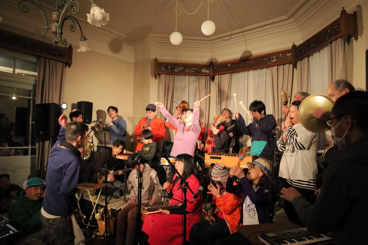 2005年結成、知的な障害のある人、音楽家、美術家、ダンサー、福祉従事者など総勢50名からなる音楽プロジェクト。即興演奏を通じて音楽や福祉のあり方を模索しながら、ワークショップやコンサート等様々な活動を重ねている。現在も月2回のワークショップを地元、神戸にて継続中そして進化中。関西を中心に、北海道、東京、茨城、島根、宮崎、長野、石川など遠征公演も多数。2013年に行った初のイギリスツアーの様子がNHKでドキュメンタリー番組として放送される。2021年大友良英プロデュースによるスタジオ録音アルバム『OTO』リリース。2022年ドキュメンタリー映画「音の行方」公開。2025年に結成20年を迎える。